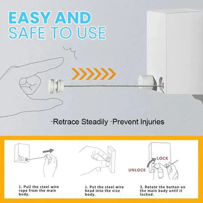اسحب حبل الغسيل ثم أدخل السلك الفولاذي في جسم الرذيلة، ثم قم بإغلاقه باستخدام القفل الآمن للحصول على تجفيف ثابت ومستقر. تصميم موحد وبطيء الانكماش منع الإصابة العرضية.