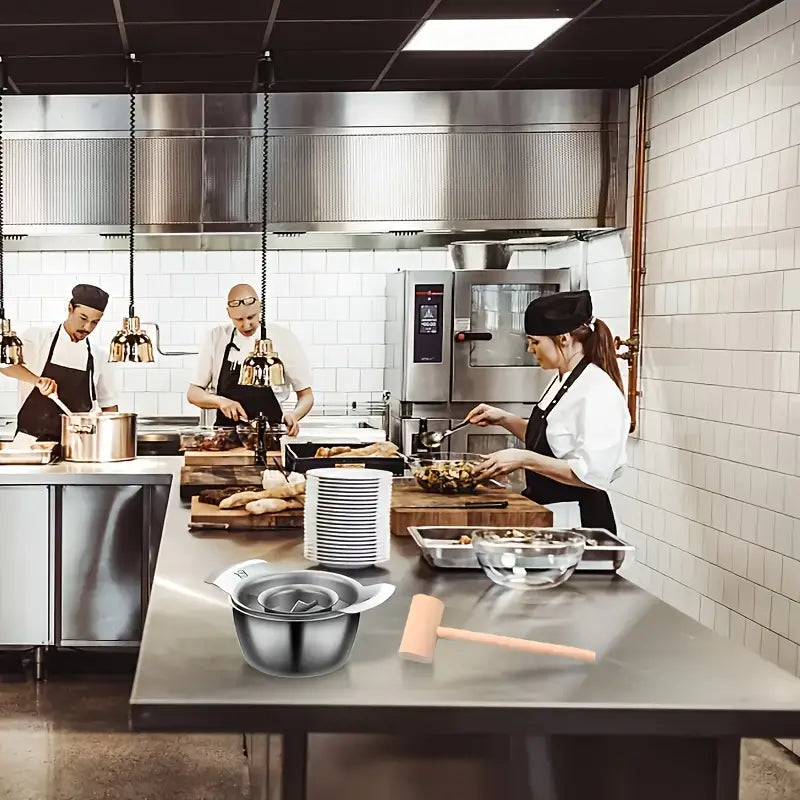 ☑ سهل الاستخدام: انزع تاج الرمانة، واقطعه إلى نصفين، ثم ضعه على الشبكة بحيث يكون الجانب المقطوع لأسفل. غطِّه بغطاء مقبب قابل للثني، واضغط عليه بقوة بملعقة ثقيلة أو مطرقة خشبية. هذه العملية البسيطة تفصل الكيراتين عن الجلد بسرعة وسهولة.