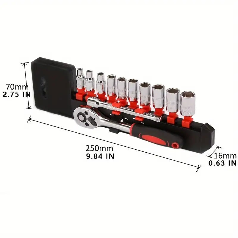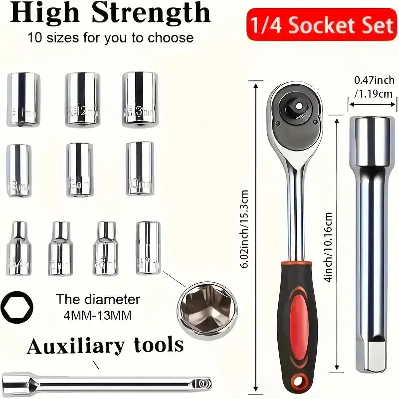 ✅ ENOUGH FOR YOU - 1/4” SOCKETS includes 10 Cr-V Sockets 4, 5, 6, 7, 8, 9, 10, 11, 12, 13 mm on 10 collecting holders, each socket is labeled with the size, which makes organizing easy.