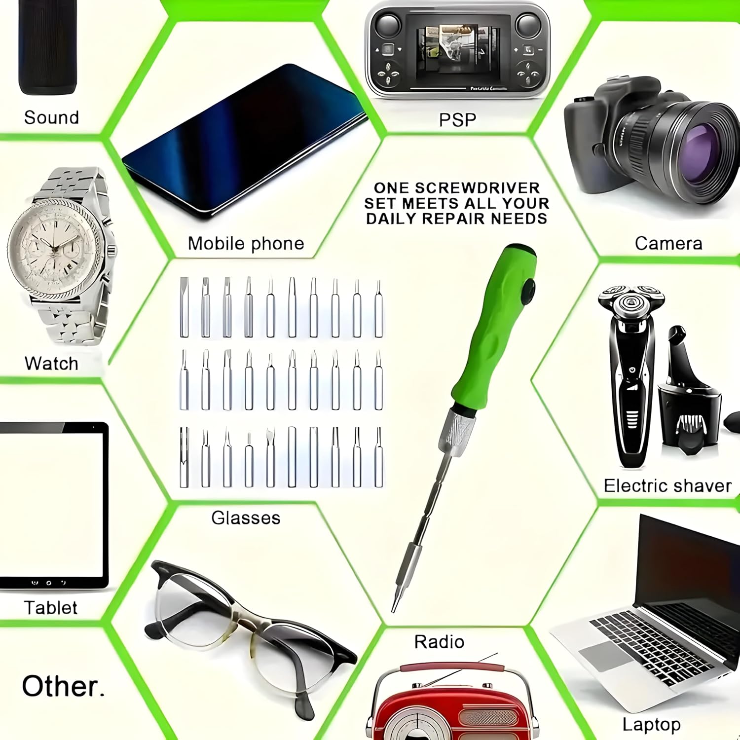 ๐ช Versatile 32-in-1 Set โ Includes 32 precision screwdriver bits to handle a wide range of small repair tasks, from electronics to glasses and watches.