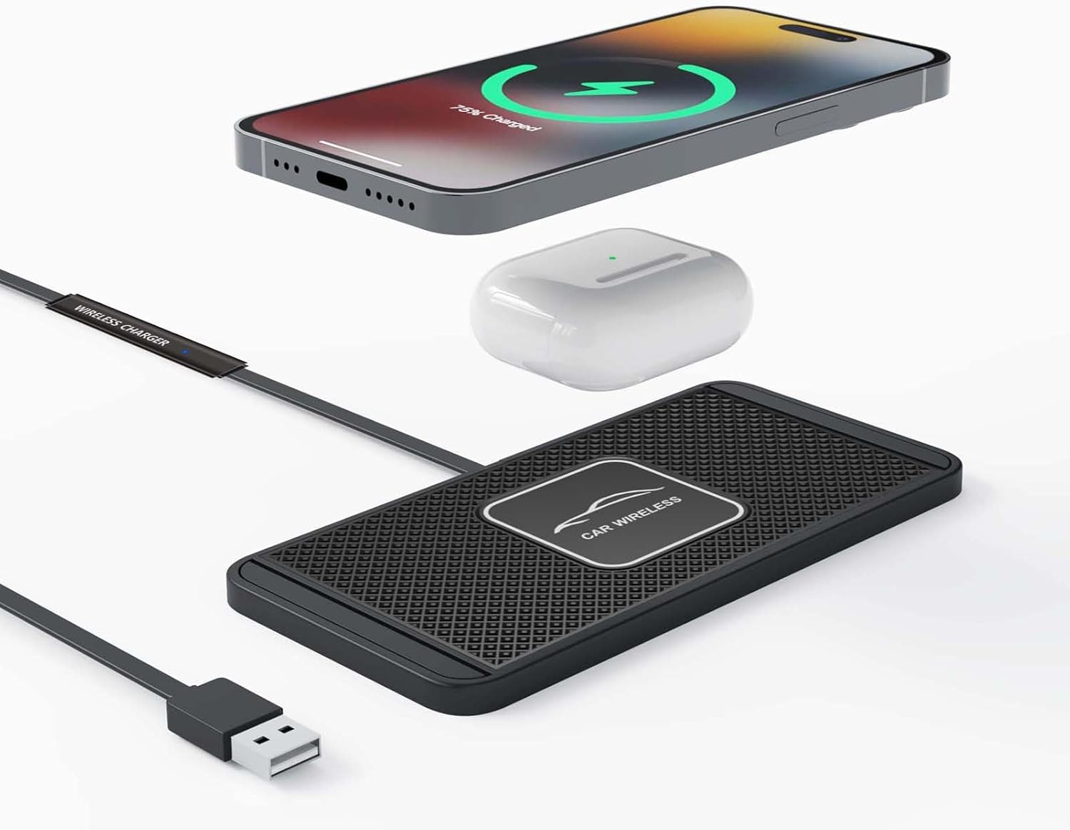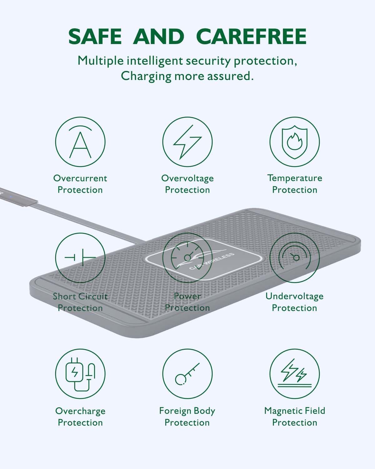 📱 Wireless Car Charger Charging Mat with Latest Unique Anti-overheating Design - It's a quick phone charger tray which is suitable for various cars, trucks, SUVs, and sedan cars. The wireless pad will not get hot while charging because the PCB board is outside, which is far away from the charger coil and the phone