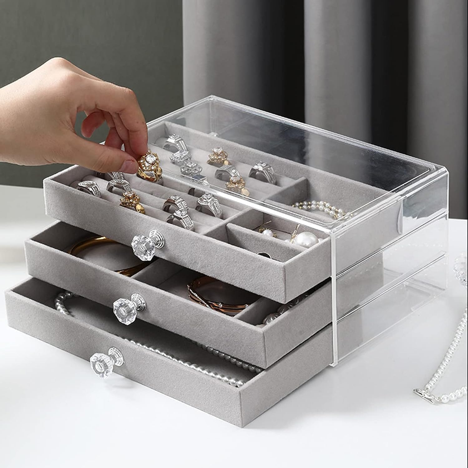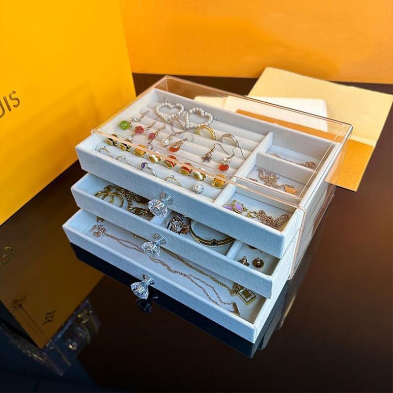 ✔ Acrylic Jewelry Organizer Box with 3 Drawers: Different compartments keep your jewelry from clutter. It easily stores jewelry of different sizes, including necklaces, bracelets, and large earrings like hoops.
