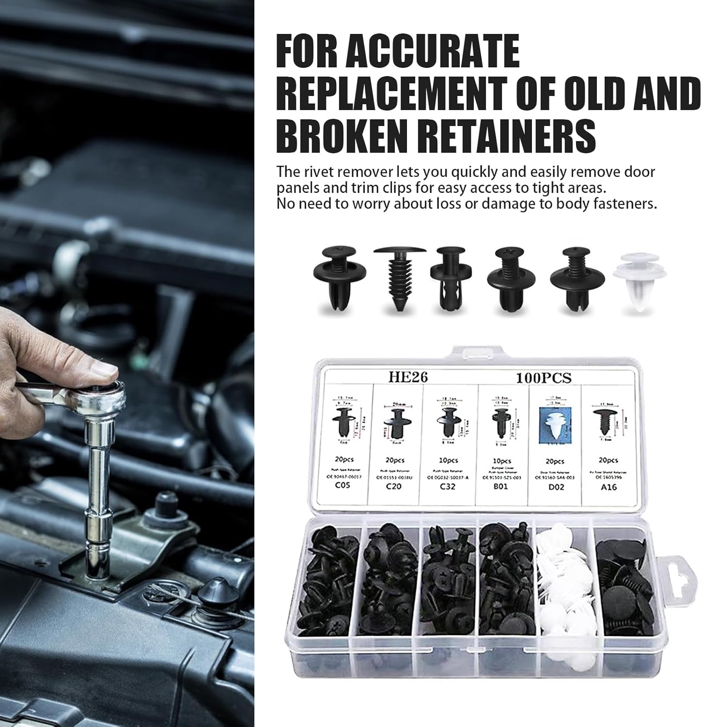 ๐ฉ Package Includes: This kit includes 100 pieces of fasteners and a handy removal tool, making it easy to install and remove the clips without causing damage to the vehicle. The organized storage box helps keep all pieces for quick access.